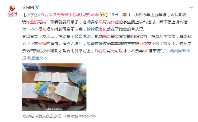 為了逃避開學(xué)被老師懲罰,??谝恍W(xué)生直接把書包扔了。