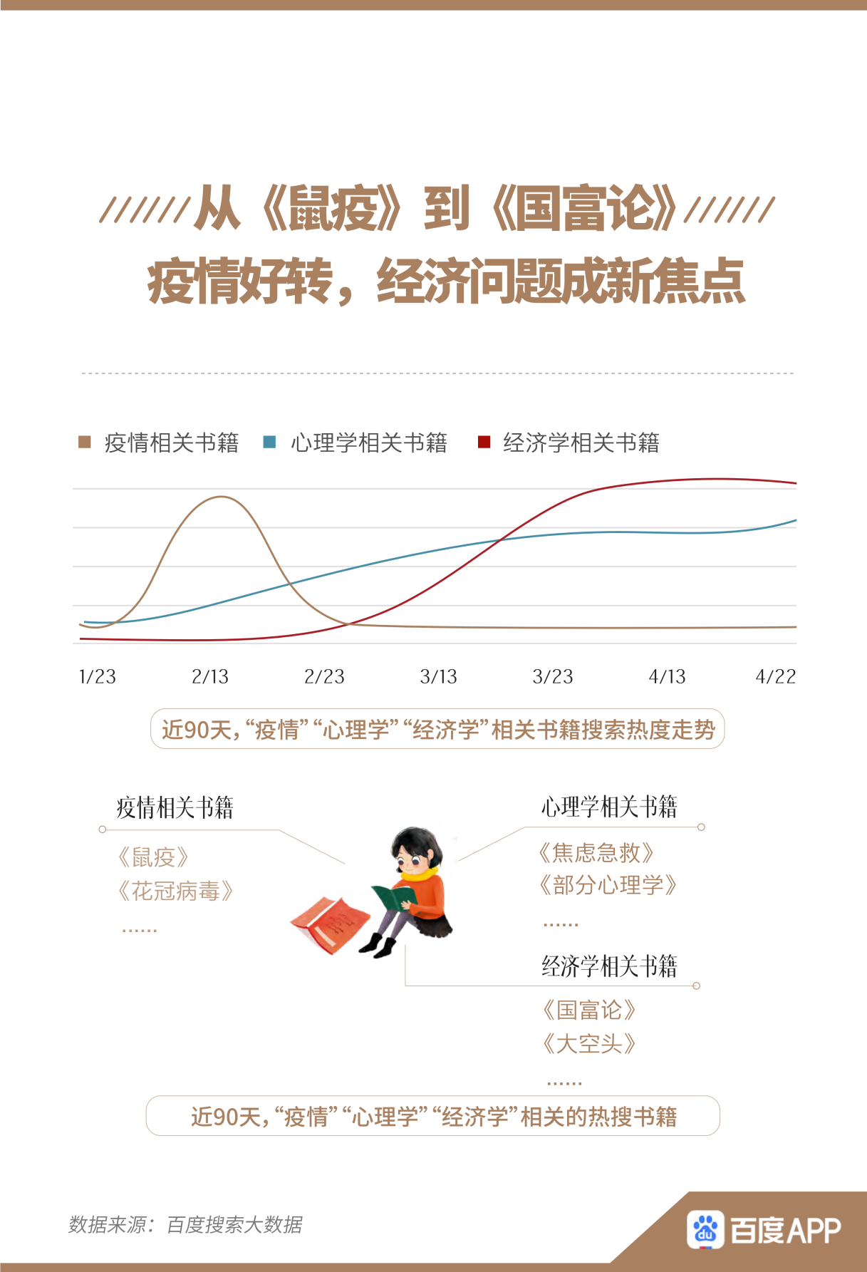 與此同時,疫情變化也影響著人們的閱讀“口味”。報告顯示,在疫情暴發(fā)之初,與“疫情”相關書籍的搜索熱度迅速上升,《鼠疫》、《花冠病毒》等具有疫情背景的書籍成為熱搜。隨著國內(nèi)疫情好轉,疫情對心理、經(jīng)濟的影響逐漸受到人們更多關注,《焦慮急救》、《國富論》等“心理學”、“經(jīng)濟學”相關書籍的搜索熱度均在3月上漲。