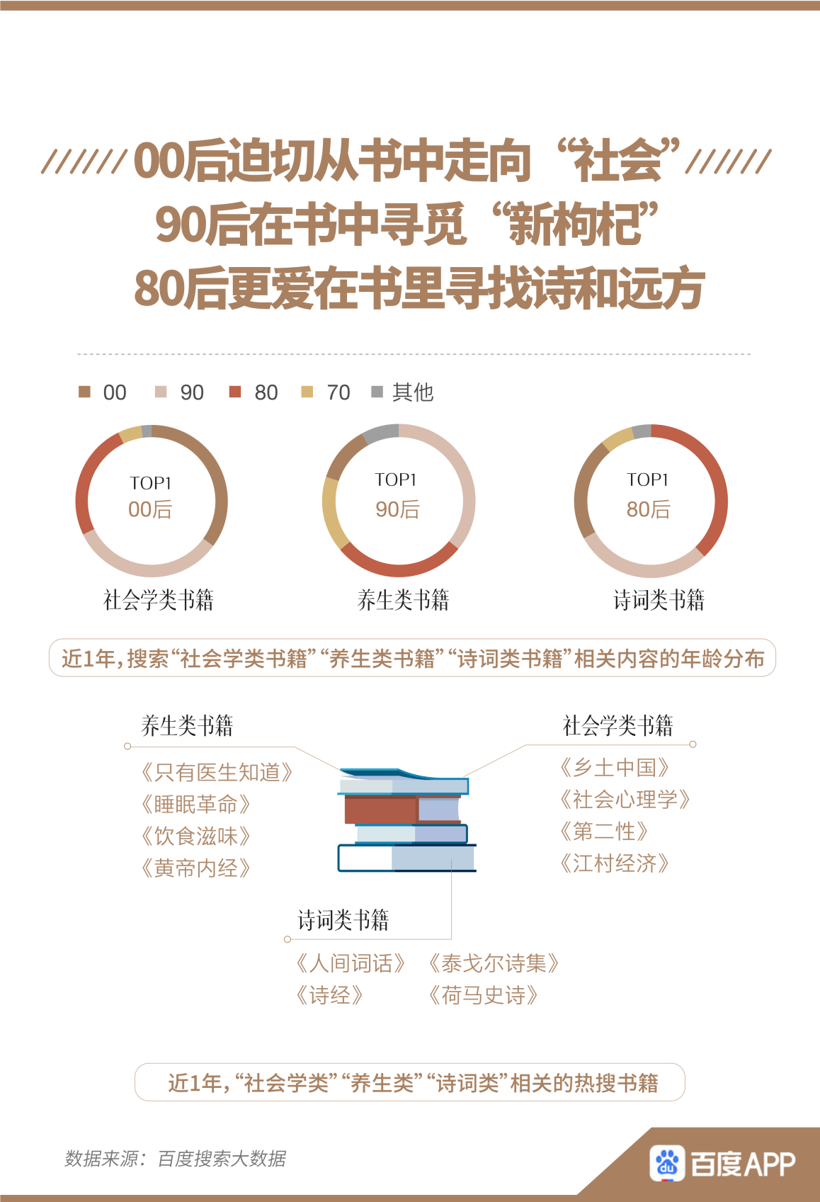 已經(jīng)步入而立之年的90后,開始關注“精神養(yǎng)生”。邊熬夜,邊閱讀《睡眠革命》、《只有醫(yī)生知道》等養(yǎng)生類書籍是他們的生活常態(tài)。而該養(yǎng)生的中年人不僅是閱讀小說的主力軍,也是搜索“詩詞書籍”最多的人群。