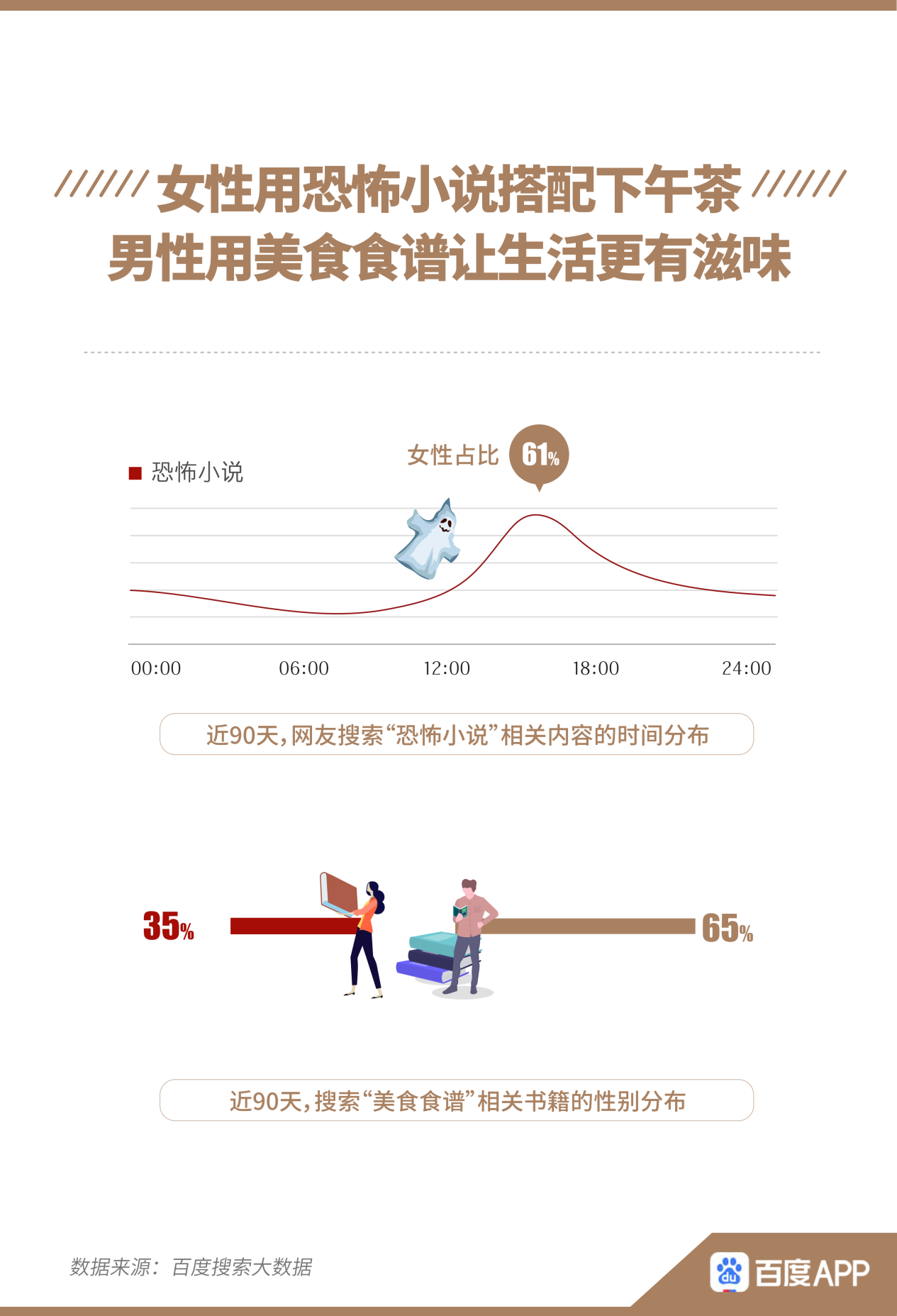 與往常印象相反,搜索“恐怖小說”相關內(nèi)容的人群中,女性比男性更多,占比61%,下午15時是搜索的高峰時間。而男性更關注“美食食譜”相關書籍,在搜索相關書籍的人群中占比65%。
