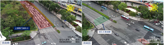 針對這一現(xiàn)象,深圳交警將東向一條直行車道改為左轉車道,并根據實際流量提高了東方向左轉綠燈時長。優(yōu)化后路口排隊現(xiàn)象得到緩解路口總平均排隊長度由310米下降至168米,降幅45.80%。