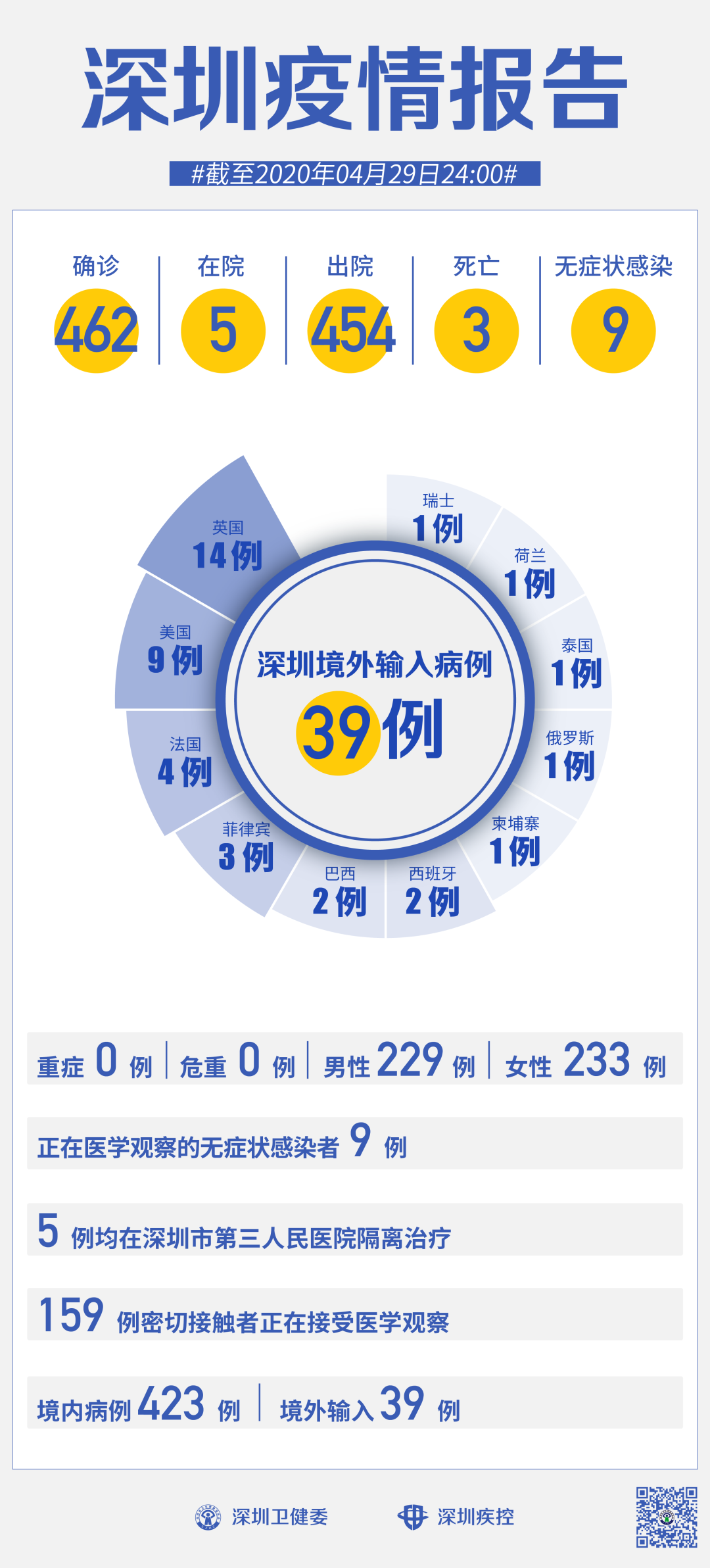 截至4月29日24時,深圳累計報告新冠肺炎病例462例。4月29日當天新增出院3例。