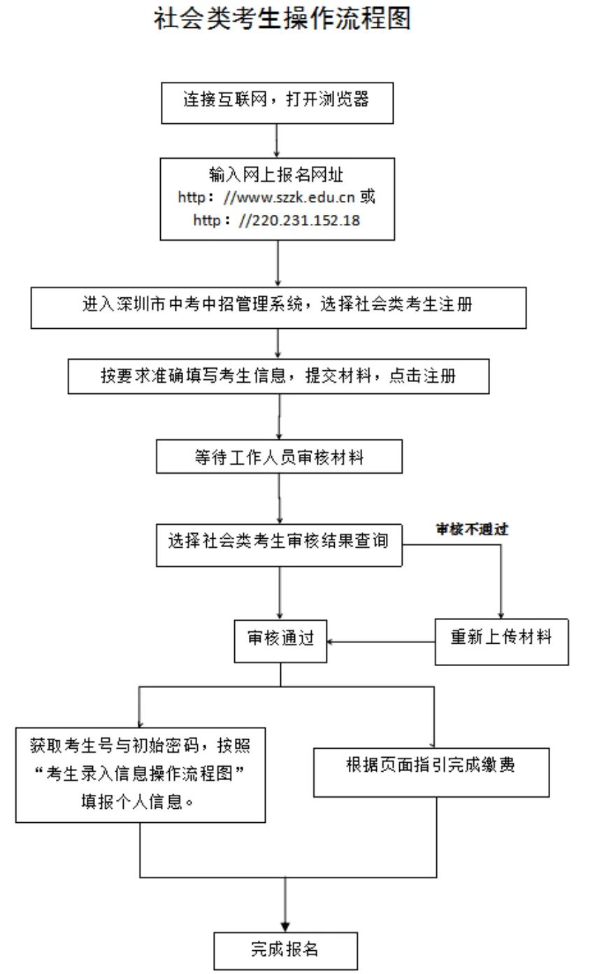 見圳客戶端·深圳新聞網(wǎng)2020年4月30日訊 據(jù)深圳市教育局消息,2020年深圳高中階段學(xué)校招生考試(以下簡稱“中考”)報名定于5月6日-15日進(jìn)行,考試時間為7月20日-21日。 今年本市應(yīng)屆初中畢業(yè)生仍繼續(xù)在就讀學(xué)校集體辦理報名手續(xù)。符合深圳中考報名條件的深圳戶籍往屆生、在市外就讀的深圳戶籍應(yīng)屆初中畢業(yè)生(以下簡稱“社會類考生”)采用網(wǎng)上報名方式進(jìn)行報名。 報名條件 一、具有我市戶籍的初中畢業(yè)生,可以在我市報名參加中考。 二、具有我市初三學(xué)籍的隨遷子女可以報名參加中考,同時符合以下條件的,可以參加相應(yīng)的公辦普高、民辦普高和中職學(xué)校的劃線錄取。 (一)父親或母親在我市具有合法穩(wěn)定職業(yè); (二)父親或母親在我市具有合法穩(wěn)定住所; (三)父親或母親持有有效《深圳經(jīng)濟(jì)特區(qū)居住證》; (四)父親或母親在我市繳納基本養(yǎng)老保險及基本醫(yī)療保險,且至少其中一個險種累計繳費滿3年,社保累計年限計算截至2020年8月31日; (五)隨遷子女在我市具有3年完整初中學(xué)籍。 不符合上述條件但具有我市初中學(xué)籍的隨遷子女,可以在我市參加中考,但僅限于參加民辦普高補錄或中職學(xué)校注冊入學(xué)。 三、高中階段學(xué)校在校生不得報名。 本市應(yīng)屆初中畢業(yè)生報名辦法 本市應(yīng)屆初中畢業(yè)生于5月6日至7日在就讀學(xué)校集體辦理報名手續(xù)。 今年中考繼續(xù)實行網(wǎng)上報名。要求各學(xué)校開放計算機房,為本??忌暇W(wǎng)報名提供方便。 5月8日至15日,學(xué)校組織考生進(jìn)行電子攝像,學(xué)校和考生分別上網(wǎng)錄入報名信息,考生錄入信息可參考“考生錄入信息流程圖”進(jìn)行操作。 市教育局強調(diào),學(xué)校不得以任何理由拒絕有本校學(xué)籍的應(yīng)屆畢業(yè)生報考(參加中職學(xué)校自主招生、注冊入學(xué)的考生,也須報名參加中考)。如有違反者,將嚴(yán)肅查處,并追究相關(guān)人員責(zé)任。同時要求各區(qū)有關(guān)職能部門、各有關(guān)學(xué)校(報名點)要嚴(yán)格審查報名材料。對不符合報名條件、弄虛作假而被錄取的考生,一經(jīng)發(fā)現(xiàn),取消其錄取資格;已經(jīng)到錄取學(xué)校報到注冊的,取消其學(xué)籍,并追究相關(guān)人員責(zé)任。 社會類考生報名辦法 社會類考生采用網(wǎng)上報名方式進(jìn)行報名。報名考生需在5月6日至15日登錄報名網(wǎng)址(http://www.szzk.edu.cn/),按照提示進(jìn)行網(wǎng)上注冊,上傳報名審核資料,由考生戶籍所在區(qū)社會報名點進(jìn)行線上審核,審核通過后系統(tǒng)將生成中考考生號及初始密碼,考生需用獲取的考號及密碼登錄中考中招管理系統(tǒng),填寫個人信息,具體操作可參考“考生錄入信息流程圖”。同時需在報名截止前根據(jù)指引完成網(wǎng)上繳費。 若考生網(wǎng)上報名審核不通過,需按照系統(tǒng)的不通過原因提示,重新補充審核資料,如多次上傳資料失敗或?qū)徍瞬煌ㄟ^,考生可撥打戶籍所在區(qū)的社會報名點電話進(jìn)行咨詢或電話預(yù)約,按照工作人員指示進(jìn)行操作報名,不要在未預(yù)約的情況下前往社會報名點,盡量避免出行,減少人員聚集。 社會類考生操作流程如下圖: