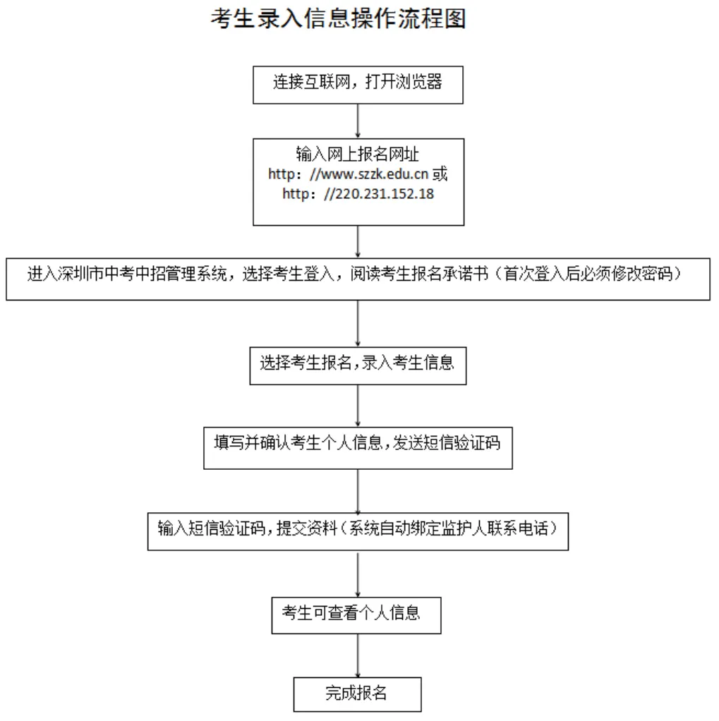 見(jiàn)圳客戶端·深圳新聞網(wǎng)2020年4月30日訊 據(jù)深圳市教育局消息,2020年深圳高中階段學(xué)校招生考試(以下簡(jiǎn)稱“中考”)報(bào)名定于5月6日-15日進(jìn)行,考試時(shí)間為7月20日-21日。 今年本市應(yīng)屆初中畢業(yè)生仍繼續(xù)在就讀學(xué)校集體辦理報(bào)名手續(xù)。符合深圳中考報(bào)名條件的深圳戶籍往屆生、在市外就讀的深圳戶籍應(yīng)屆初中畢業(yè)生(以下簡(jiǎn)稱“社會(huì)類考生”)采用網(wǎng)上報(bào)名方式進(jìn)行報(bào)名。 報(bào)名條件 一、具有我市戶籍的初中畢業(yè)生,可以在我市報(bào)名參加中考。 二、具有我市初三學(xué)籍的隨遷子女可以報(bào)名參加中考,同時(shí)符合以下條件的,可以參加相應(yīng)的公辦普高、民辦普高和中職學(xué)校的劃線錄取。 (一)父親或母親在我市具有合法穩(wěn)定職業(yè); (二)父親或母親在我市具有合法穩(wěn)定住所; (三)父親或母親持有有效《深圳經(jīng)濟(jì)特區(qū)居住證》; (四)父親或母親在我市繳納基本養(yǎng)老保險(xiǎn)及基本醫(yī)療保險(xiǎn),且至少其中一個(gè)險(xiǎn)種累計(jì)繳費(fèi)滿3年,社保累計(jì)年限計(jì)算截至2020年8月31日; (五)隨遷子女在我市具有3年完整初中學(xué)籍。 不符合上述條件但具有我市初中學(xué)籍的隨遷子女,可以在我市參加中考,但僅限于參加民辦普高補(bǔ)錄或中職學(xué)校注冊(cè)入學(xué)。 三、高中階段學(xué)校在校生不得報(bào)名。 本市應(yīng)屆初中畢業(yè)生報(bào)名辦法 本市應(yīng)屆初中畢業(yè)生于5月6日至7日在就讀學(xué)校集體辦理報(bào)名手續(xù)。 今年中考繼續(xù)實(shí)行網(wǎng)上報(bào)名。要求各學(xué)校開(kāi)放計(jì)算機(jī)房,為本??忌暇W(wǎng)報(bào)名提供方便。 5月8日至15日,學(xué)校組織考生進(jìn)行電子攝像,學(xué)校和考生分別上網(wǎng)錄入報(bào)名信息,考生錄入信息可參考“考生錄入信息流程圖”進(jìn)行操作。 市教育局強(qiáng)調(diào),學(xué)校不得以任何理由拒絕有本校學(xué)籍的應(yīng)屆畢業(yè)生報(bào)考(參加中職學(xué)校自主招生、注冊(cè)入學(xué)的考生,也須報(bào)名參加中考)。如有違反者,將嚴(yán)肅查處,并追究相關(guān)人員責(zé)任。同時(shí)要求各區(qū)有關(guān)職能部門、各有關(guān)學(xué)校(報(bào)名點(diǎn))要嚴(yán)格審查報(bào)名材料。對(duì)不符合報(bào)名條件、弄虛作假而被錄取的考生,一經(jīng)發(fā)現(xiàn),取消其錄取資格;已經(jīng)到錄取學(xué)校報(bào)到注冊(cè)的,取消其學(xué)籍,并追究相關(guān)人員責(zé)任。 社會(huì)類考生報(bào)名辦法 社會(huì)類考生采用網(wǎng)上報(bào)名方式進(jìn)行報(bào)名。報(bào)名考生需在5月6日至15日登錄報(bào)名網(wǎng)址(http://www.szzk.edu.cn/),按照提示進(jìn)行網(wǎng)上注冊(cè),上傳報(bào)名審核資料,由考生戶籍所在區(qū)社會(huì)報(bào)名點(diǎn)進(jìn)行線上審核,審核通過(guò)后系統(tǒng)將生成中考考生號(hào)及初始密碼,考生需用獲取的考號(hào)及密碼登錄中考中招管理系統(tǒng),填寫個(gè)人信息,具體操作可參考“考生錄入信息流程圖”。同時(shí)需在報(bào)名截止前根據(jù)指引完成網(wǎng)上繳費(fèi)。 若考生網(wǎng)上報(bào)名審核不通過(guò),需按照系統(tǒng)的不通過(guò)原因提示,重新補(bǔ)充審核資料,如多次上傳資料失敗或?qū)徍瞬煌ㄟ^(guò),考生可撥打戶籍所在區(qū)的社會(huì)報(bào)名點(diǎn)電話進(jìn)行咨詢或電話預(yù)約,按照工作人員指示進(jìn)行操作報(bào)名,不要在未預(yù)約的情況下前往社會(huì)報(bào)名點(diǎn),盡量避免出行,減少人員聚集。 社會(huì)類考生操作流程如下圖: 考生錄入信息操作流程如下圖: 中考社會(huì)報(bào)名點(diǎn)一覽表 深圳各類考生具體報(bào)考范圍、各類升學(xué)資格申報(bào)所需條件和材料以及相關(guān)報(bào)名要求,考生可通過(guò)深圳市招生考試辦公室官網(wǎng)(zkb.sz.gov.cn)及官方微信公眾號(hào)(深圳市招生考試辦公室)查閱,市招考辦也將第一時(shí)間通過(guò)上述渠道發(fā)布各類中考資訊。