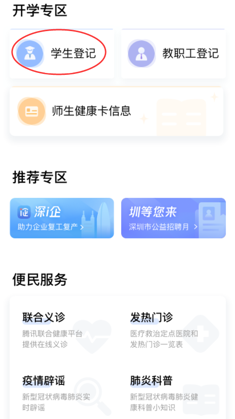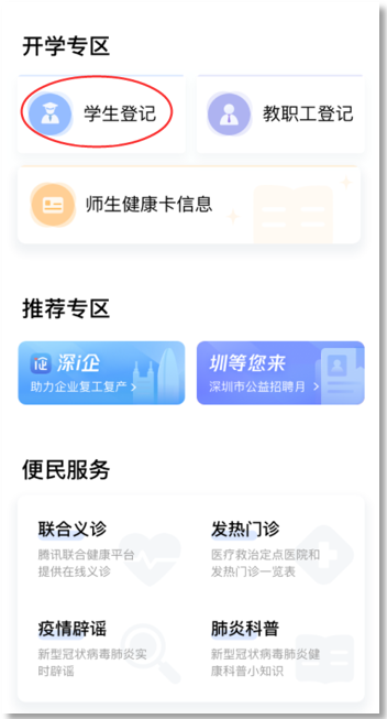 ①在首頁開學(xué)專區(qū),點擊“學(xué)生登記”進入申報人員列表,進行自主申報和實名認證,再進行開學(xué)登記。