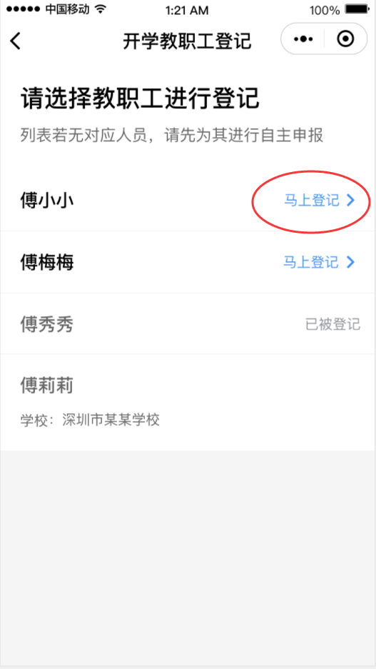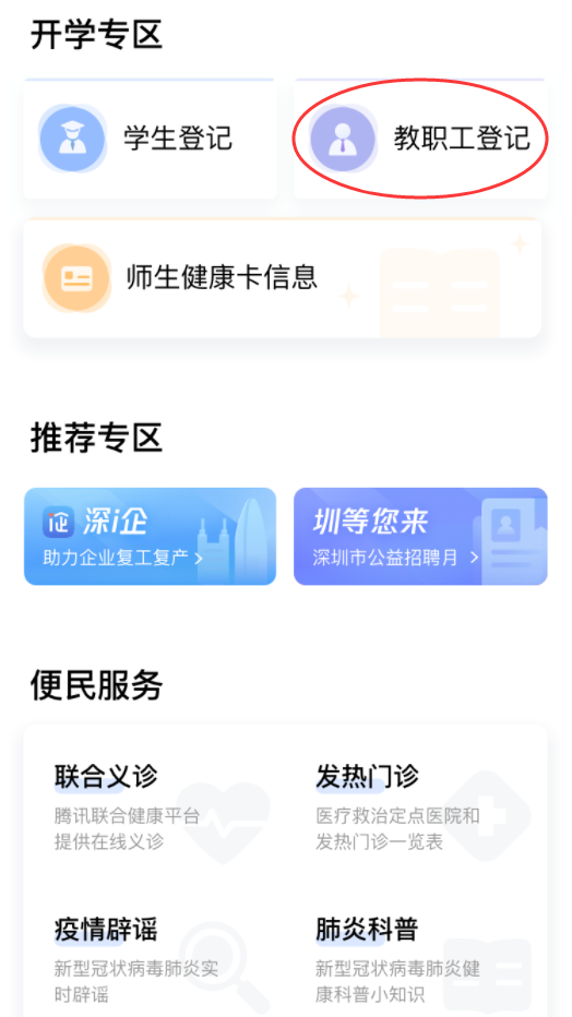 ①在首頁(yè)開(kāi)學(xué)專(zhuān)區(qū),點(diǎn)擊“教職工登記”進(jìn)入申報(bào)人員列表,進(jìn)行自主申報(bào)和實(shí)名認(rèn)證。