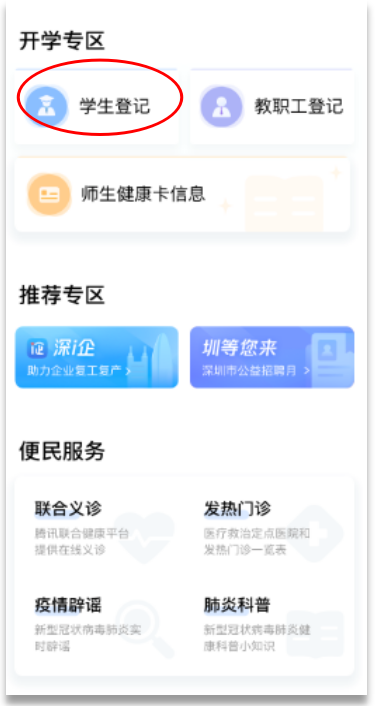 ①在首頁(yè)開(kāi)學(xué)專(zhuān)區(qū),點(diǎn)擊“學(xué)生登記”進(jìn)入申報(bào)人員列表,進(jìn)行自主申報(bào)和實(shí)名認(rèn)證,再進(jìn)行開(kāi)學(xué)登記。