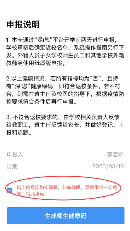 ③完成健康信息申報(bào),包括選擇家庭住址、填寫(xiě)所在部門(mén)、申報(bào)健康情況等,請(qǐng)勾選申報(bào)承諾,點(diǎn)擊“生成師生健康碼”即可完成健康申報(bào)。