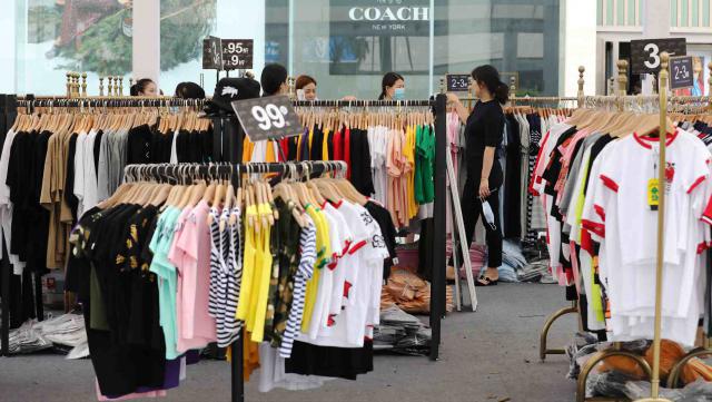 ▲夏季服裝開(kāi)售,不少商家打折促銷,吸引市民選購(gòu)。