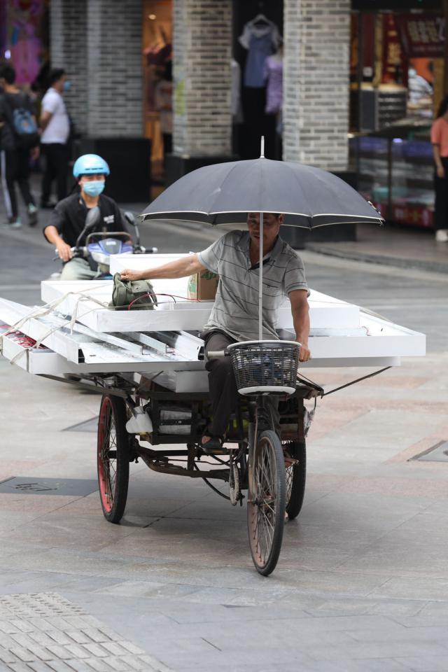 ▲市民在電動(dòng)車、三輪車上支起防曬傘。