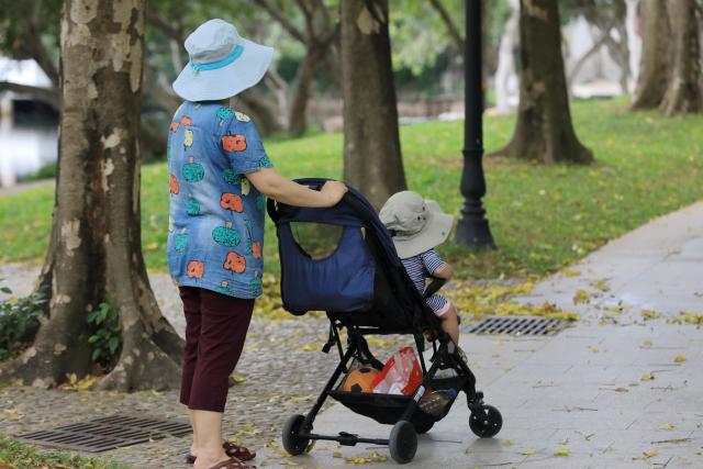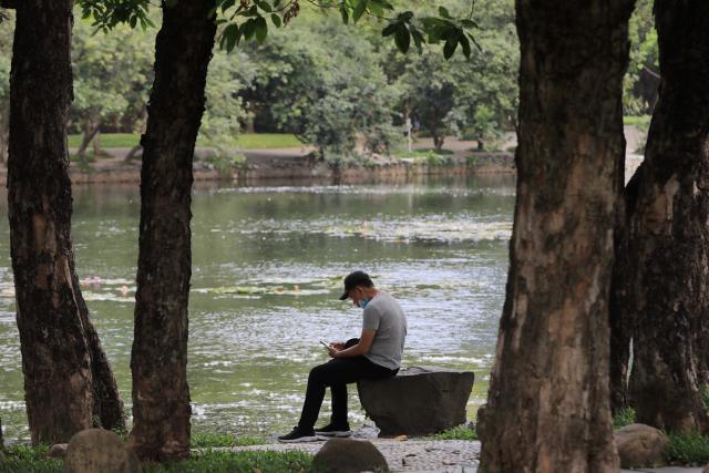 ▲市民在公園的樹(shù)下乘涼。