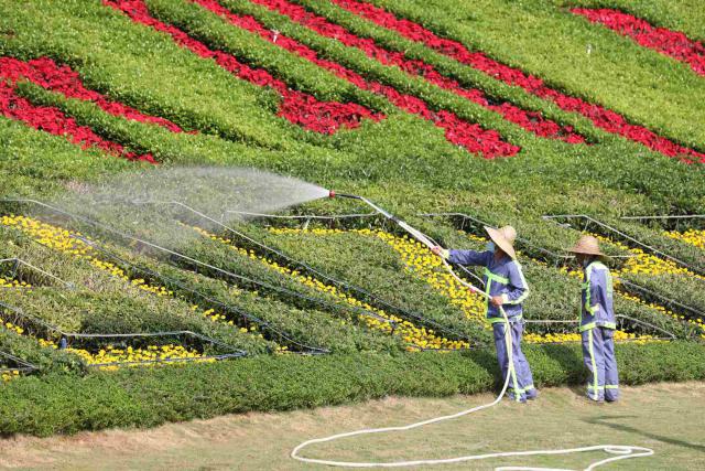 ▲公園里,戴著遮陽(yáng)帽的工作人員忙著給花草"補(bǔ)水降溫"。