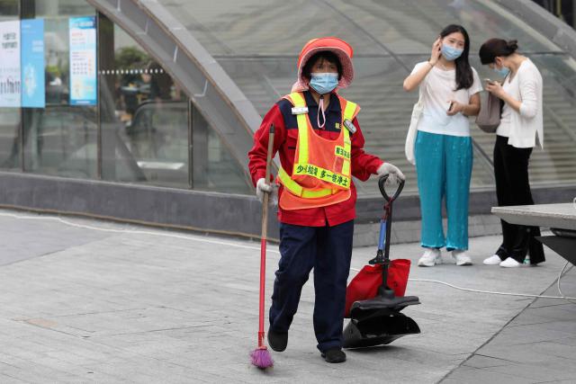 ▲保潔員戴著遮陽(yáng)帽在街頭忙碌。