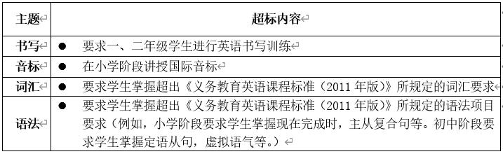 1.培訓(xùn)不得超出現(xiàn)行義務(wù)教育英語課程標(biāo)準(zhǔn)規(guī)定的各學(xué)段分級(jí)標(biāo)準(zhǔn),禁止將初中知識(shí)類的教學(xué)內(nèi)容提前至小學(xué)教學(xué)與測(cè)評(píng),禁止將現(xiàn)行普通高中英語課程標(biāo)準(zhǔn)規(guī)定的知識(shí)類教學(xué)內(nèi)容提前至初中教學(xué)與測(cè)評(píng)。