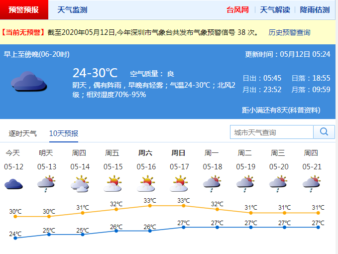 見圳客戶端·深圳新聞網(wǎng)2020年5月12日訊 深圳昨夜雷電+大風黃色+暴雨黃色預警齊生效,市氣象臺于2020年05月11日23時30分在全市取消暴雨黃色、大風黃色預警。預計12日白天多云間陰天,有陣雨。13日陣雨轉(zhuǎn)多云,天況逐漸轉(zhuǎn)好,14-17日多云為主,陽光充足,天氣再趨炎熱。