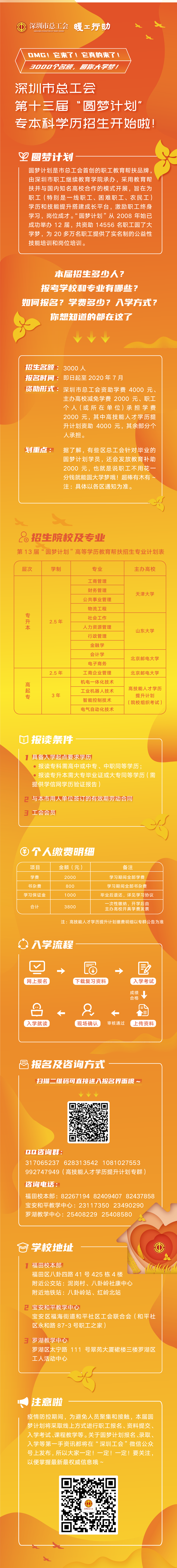 在疫情防控、復(fù)工復(fù)產(chǎn)的特殊形勢下,結(jié)合市總工會(huì)“暖工行動(dòng)”相關(guān)要求,本屆“圓夢計(jì)劃”進(jìn)一步提高幫扶精準(zhǔn)性,向受疫情影響嚴(yán)重的企業(yè)和職工傾斜,推動(dòng)企業(yè)和職工共擔(dān)責(zé)任、共克時(shí)艱,穩(wěn)定職工隊(duì)伍和就業(yè),努力做到職工多轉(zhuǎn)崗、少下崗、多就業(yè)、少失業(yè)。符合報(bào)名條件的職工可在“深圳工會(huì)”微信公眾號(hào)上進(jìn)行報(bào)名,報(bào)名截止日期為7月30日,主辦方將根據(jù)報(bào)名人數(shù)分期分批組織入學(xué)考試。入學(xué)考試采用“文化素養(yǎng)+職業(yè)技能+工作實(shí)績”的多元評(píng)價(jià)方式,在“文化素養(yǎng)”為主體考試中增加工會(huì)基本知識(shí),提高職工工會(huì)意識(shí)。所有錄取學(xué)員將于今年9月入學(xué)就讀,進(jìn)行線上線下相結(jié)合的學(xué)習(xí),在規(guī)定學(xué)制內(nèi)修滿學(xué)分將獲得各高校頒發(fā)、國家承認(rèn)的畢業(yè)證書。