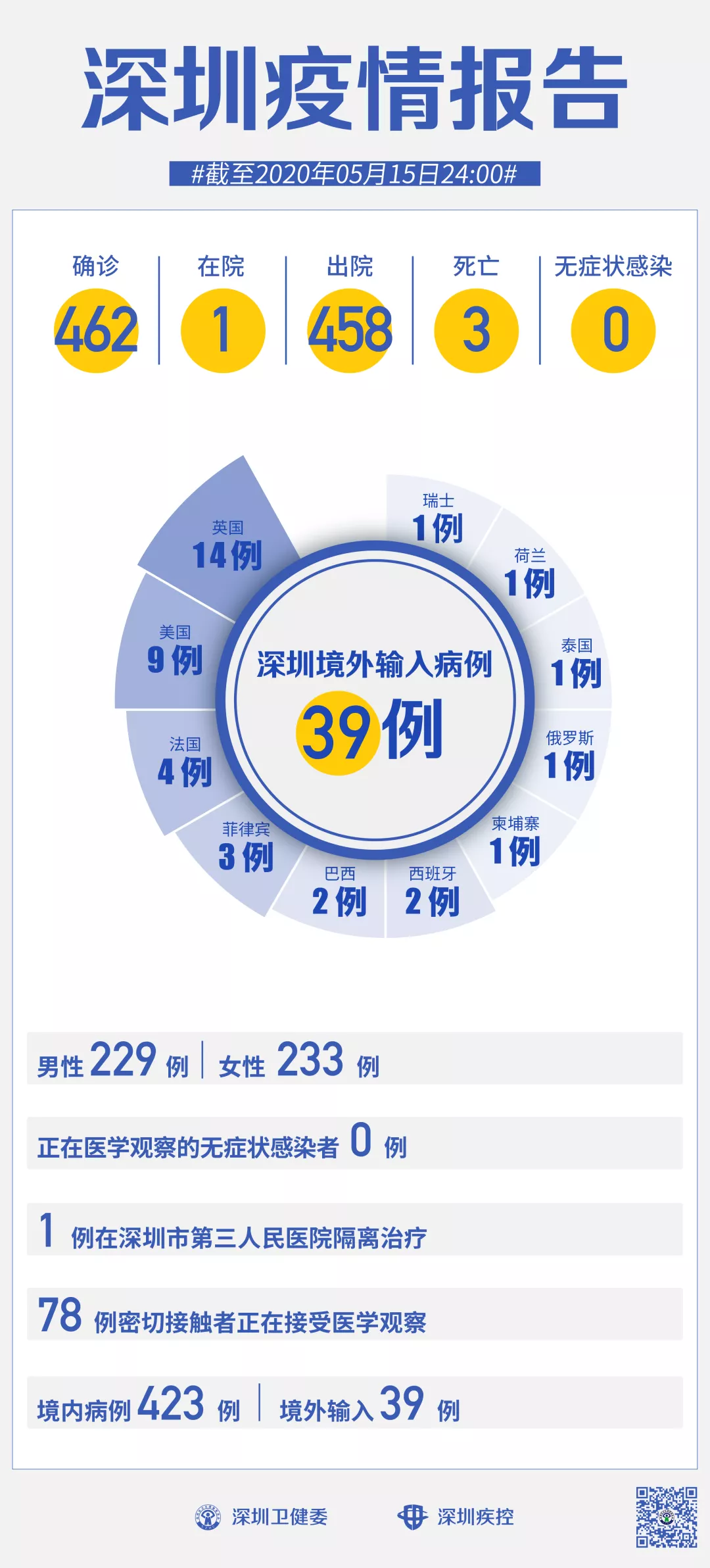 截至5月15日24時,深圳累計報告新冠肺炎病例462例。