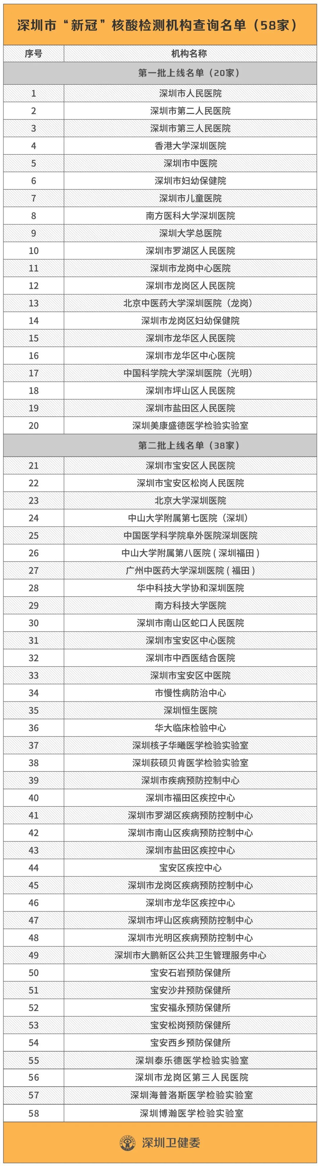 目前,深圳共有58家機構(gòu)開展新冠病毒核酸檢測,包括35家醫(yī)院、16家公共衛(wèi)生機構(gòu)和7家第三方檢測機構(gòu)。