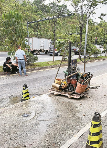 2020年5月1日,執(zhí)法支隊(duì)龍崗大隊(duì)執(zhí)法人員在轄區(qū)內(nèi)值班巡查時(shí),接到投訴稱愛南路上海外國(guó)語(yǔ)學(xué)校門口有道路施工人員鉆探時(shí)鉆破水管,現(xiàn)場(chǎng)水流滿地,請(qǐng)求執(zhí)法人員前往調(diào)查。