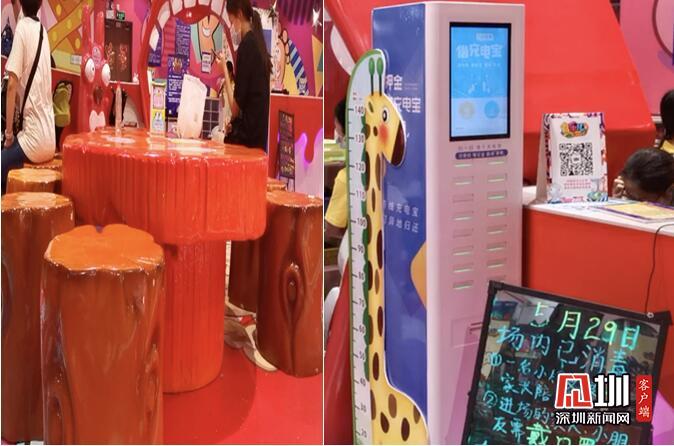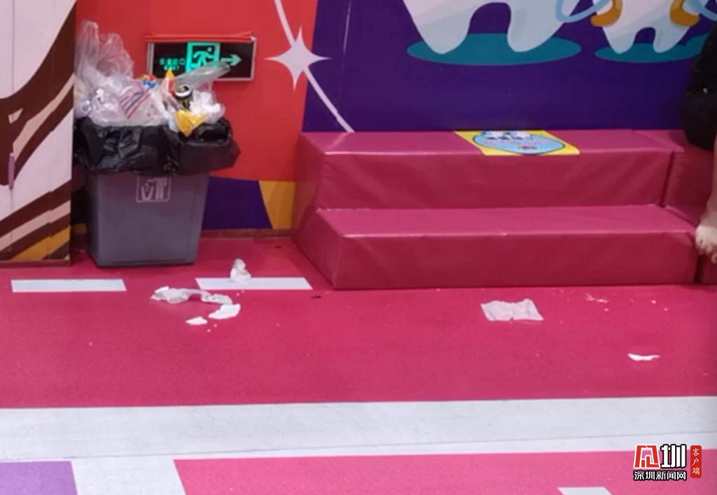 游樂場有家長休息區(qū),在前臺還有充電寶租借。但是記者注意到,在休息區(qū)角落不少垃圾散落在地面,垃圾桶裝滿了工作人員也沒有及時過來清理。