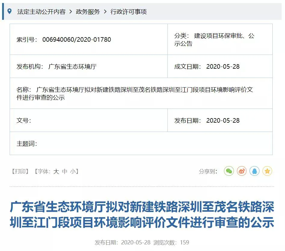 5月28日,廣東省生態(tài)環(huán)境廳發(fā)布擬對新建鐵路深圳至茂名鐵路深圳至江門段項目環(huán)境影響評價文件進行審查的公示,這意味著項目前期工作接近尾聲,距離開工又進了一步。