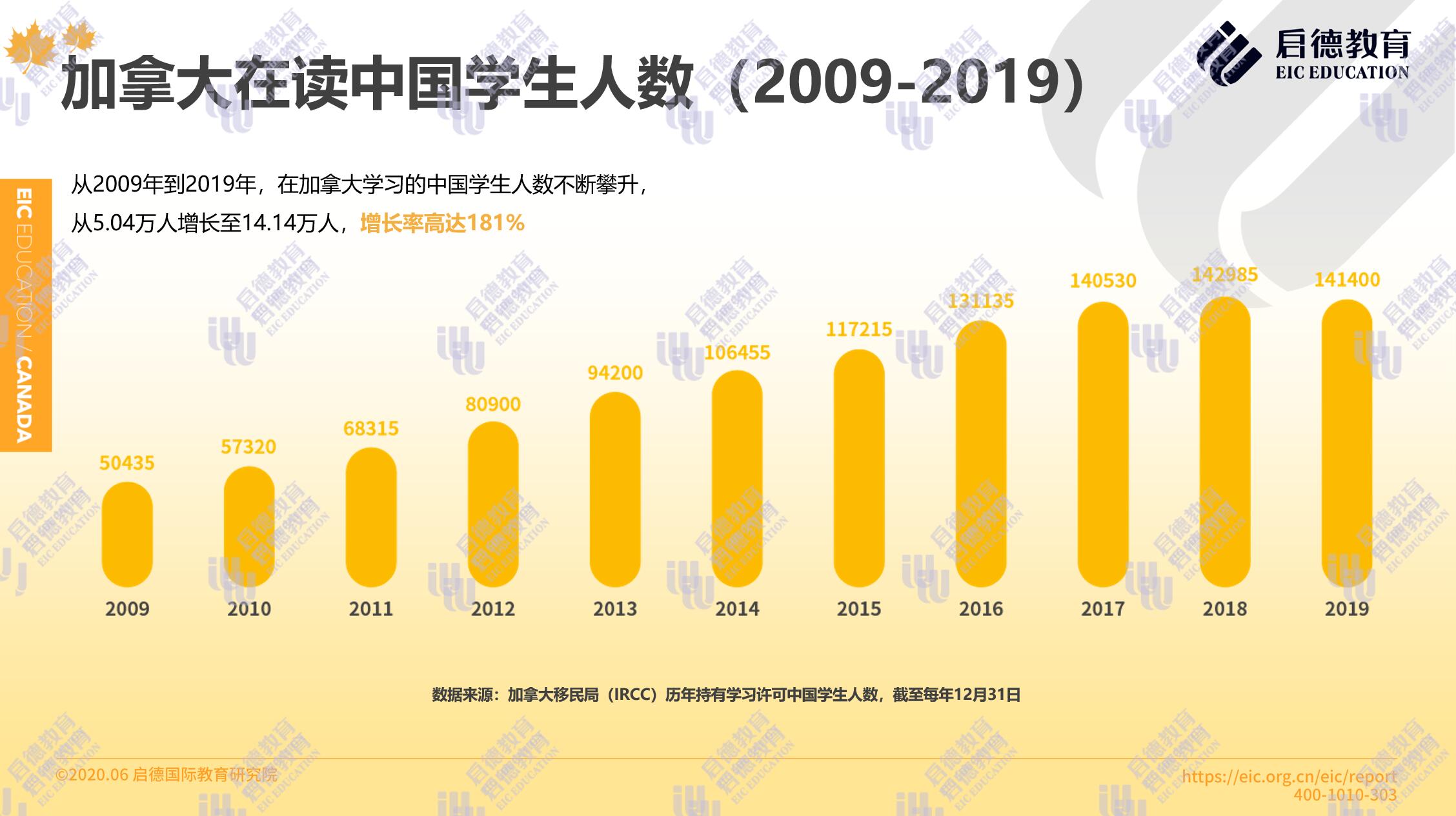 一直以來,加拿大都是中國學(xué)生四大熱門留學(xué)目的地之一。對于中國意向留學(xué)生來說,加拿大擁有教育質(zhì)量高、留學(xué)選擇靈活豐富、性價比高等優(yōu)勢。加拿大移民局( Immigration, Refugees and Citizenship Canada )公布的學(xué)習(xí)許可持有者數(shù)據(jù)顯示,2019年度約有14.14萬中國學(xué)生在加拿大留學(xué),占加拿大全部國際留學(xué)生的22.1%。中國學(xué)生人數(shù)從2009年的5.04萬人增長至2019年的14.14萬人,增長率高達(dá)181%。