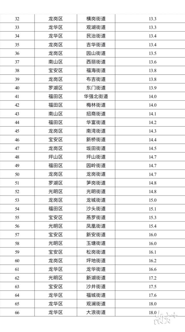 排名前十的街道是:海山、福保、桃源、南澳、葵涌、蓮塘、石巖、西鄉(xiāng)、蓮花和黃貝等街道;排名倒數(shù)前十的是:公明、馬田、龍?zhí)铩⒋罄?、觀瀾、福城、沙井、新湖、龍華和坪地等街道。
