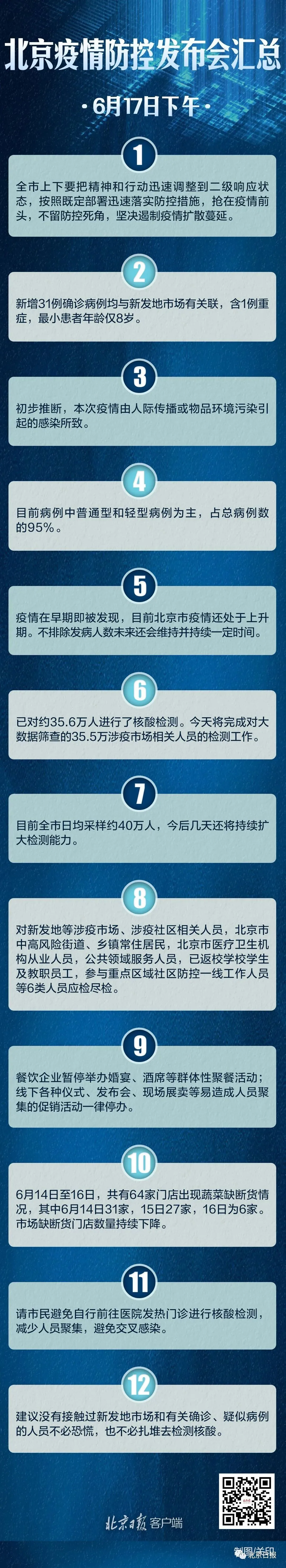 北京新冠肺炎疫情防控工作領(lǐng)導(dǎo)小組檢疫檢測工作組副組長、市委組織部副部長張強介紹,6月13日起,已迅速對新發(fā)地等出現(xiàn)疫情的市場人員、周邊小區(qū)居民、大數(shù)據(jù)排查涉疫市場人員,社區(qū)敲門行動中主動報告、有關(guān)接觸史的人員以及全市各農(nóng)貿(mào)市場工作人員約35.6萬人進行了核酸檢測。6月17日將完成對大數(shù)據(jù)篩查的涉疫市場相關(guān)人員的檢測工作,對重點行業(yè)、重點領(lǐng)域、重點地區(qū)人員的核酸檢測工作也在同步進行。
