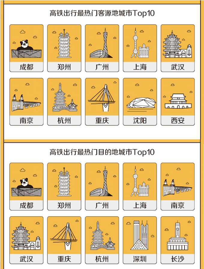 火車出行方面,依據(jù)美團火車票數(shù)據(jù),去往成都、鄭州、廣州的高鐵預(yù)訂量排名全國前三,其次是上海、南京、武漢、重慶、杭州、深圳和長沙。其中,新開高鐵線路訂單量上漲,大同—西安線、成都—貴陽線、張家口—呼和浩特線等火車票預(yù)訂量增幅較大。