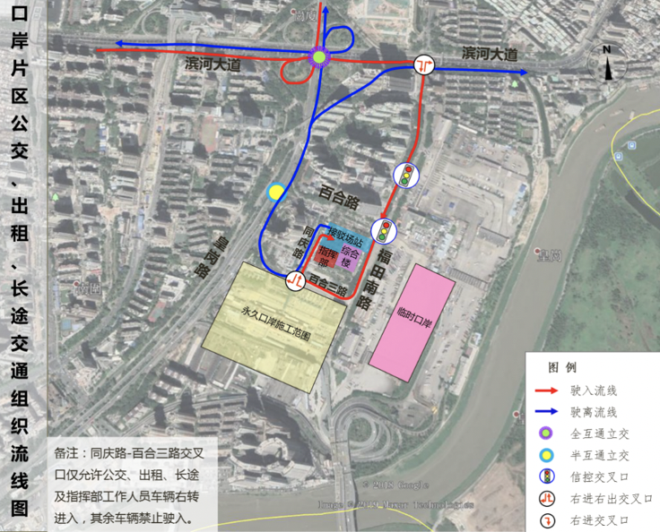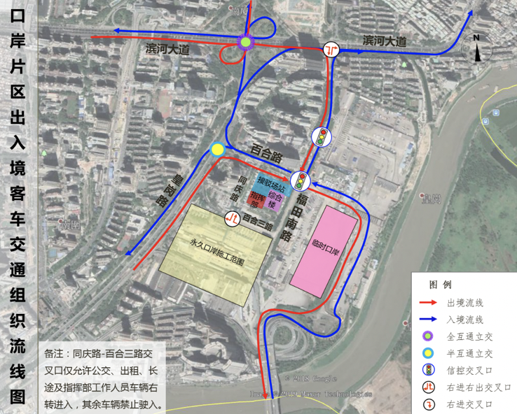 臨時口岸旅檢樓位于福田南路東側(cè),臨時交通接駁場站(公交場站、出租車場站、長途客運站)位于福田南路西側(cè)、百合路路南側(cè)。