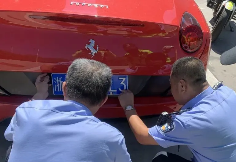 見圳客戶端·深圳新聞網(wǎng)2020年6月28日訊 2020年6月19日,深圳交警寶安大隊(duì)接群眾舉報(bào)稱:在益田假日廣場(chǎng)停車場(chǎng)有套牌車出沒。接到警情后,深圳交警立即派出鐵騎隊(duì)員趕到現(xiàn)場(chǎng),找到舉報(bào)人所描述的一輛紅色法拉利,鐵騎根據(jù)舉報(bào)人所提供線索,對(duì)車牌號(hào)為浙A7****的紅色法拉利進(jìn)行核查。