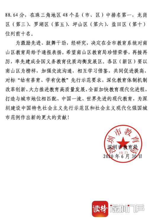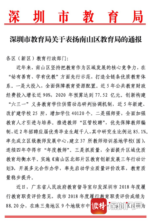 見圳客戶端·深圳新聞網(wǎng)2020年7月1日訊(深圳特區(qū)報記者 李麗)6月30日,《深圳市教育局關(guān)于表揚南山區(qū)教育局的通報》在全市教育界引起關(guān)注。通報表示,近日,廣東省人民政府教育督導(dǎo)室印發(fā)深圳市2018年度履行教育職責(zé)評價意見,深圳2018年度履行教育職責(zé)評價成績?yōu)?8.20分,在珠三角地區(qū)9個地級市中排名第一,其中,南山區(qū)成績?yōu)?8.64分,在珠三角地區(qū)48個縣(市、區(qū))中排名第一。經(jīng)研究,決定在全市教育系統(tǒng)對南山區(qū)教育局給予通報表揚,并希望南山區(qū)教育局率先建成全國義務(wù)教育優(yōu)質(zhì)均衡發(fā)展區(qū)。