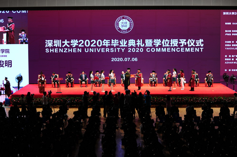 上午9時,畢業(yè)典禮在莊嚴(yán)的國歌聲中拉開了帷幕。據(jù)介紹,2020年深圳大學(xué)畢業(yè)研究生數(shù)量創(chuàng)歷史新高,達(dá)到2334名,包括44位博士學(xué)位獲得者,2290位碩士學(xué)位獲得者。其中,郭奎奎等20人獲得廣東省優(yōu)秀學(xué)生稱號,李豪道等140人榮獲國家獎學(xué)金,曾吉申等64人榮獲鵬城獎學(xué)金、騰訊創(chuàng)新獎學(xué)金。