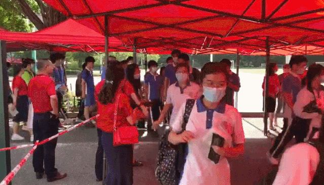 八點十分,學生走入考場,身穿紅色衣服的老師在兩側(cè)為考生送上祝福。“加油!”“老師我們出發(fā)了?!弊8B暣似鸨朔?。