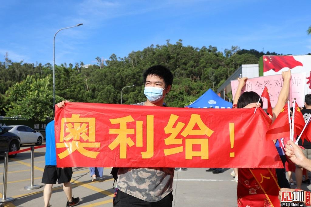 紅嶺中學(xué)考點外,“應(yīng)援團”成員為考生們舉起“奧利給”橫幅。