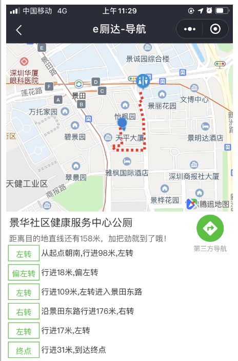 第三個(gè)功能為導(dǎo)航找?guī)?。既然已?jīng)查看到周邊有廁所分布,怎能不知道具體線(xiàn)路呢?“e廁達(dá)”中的“帶我去”按鈕可以輕松引領(lǐng)你去往定位的公廁。