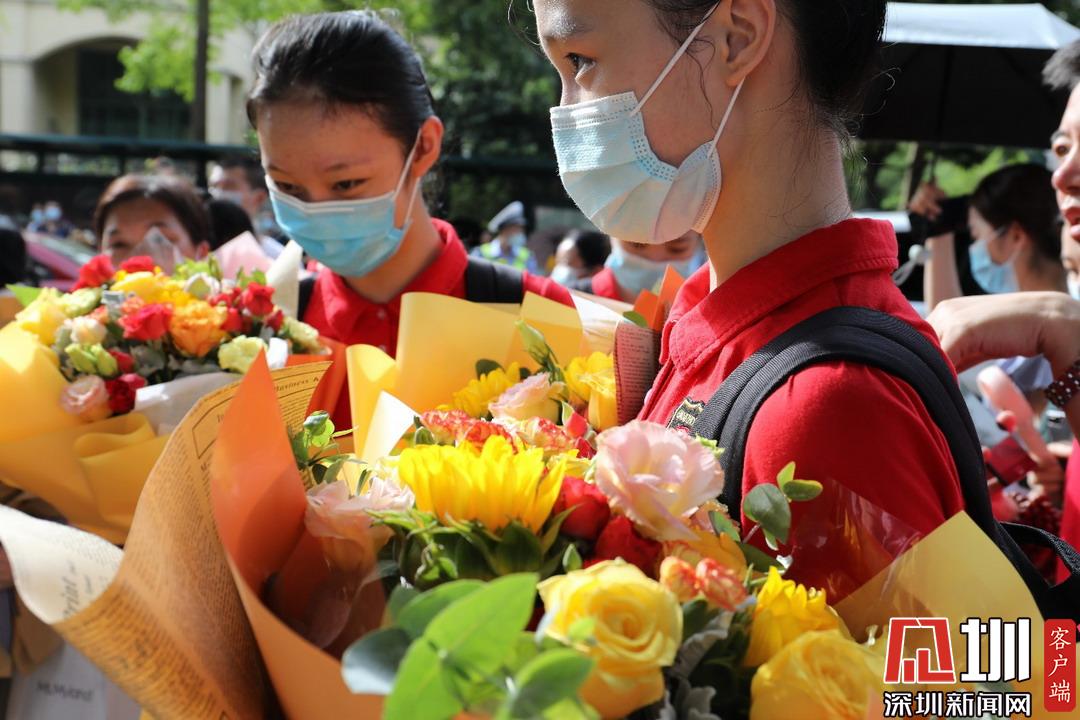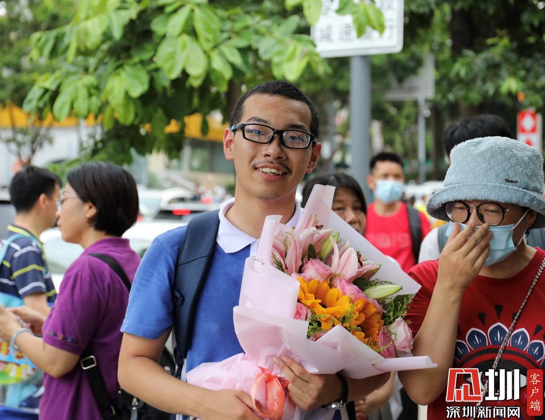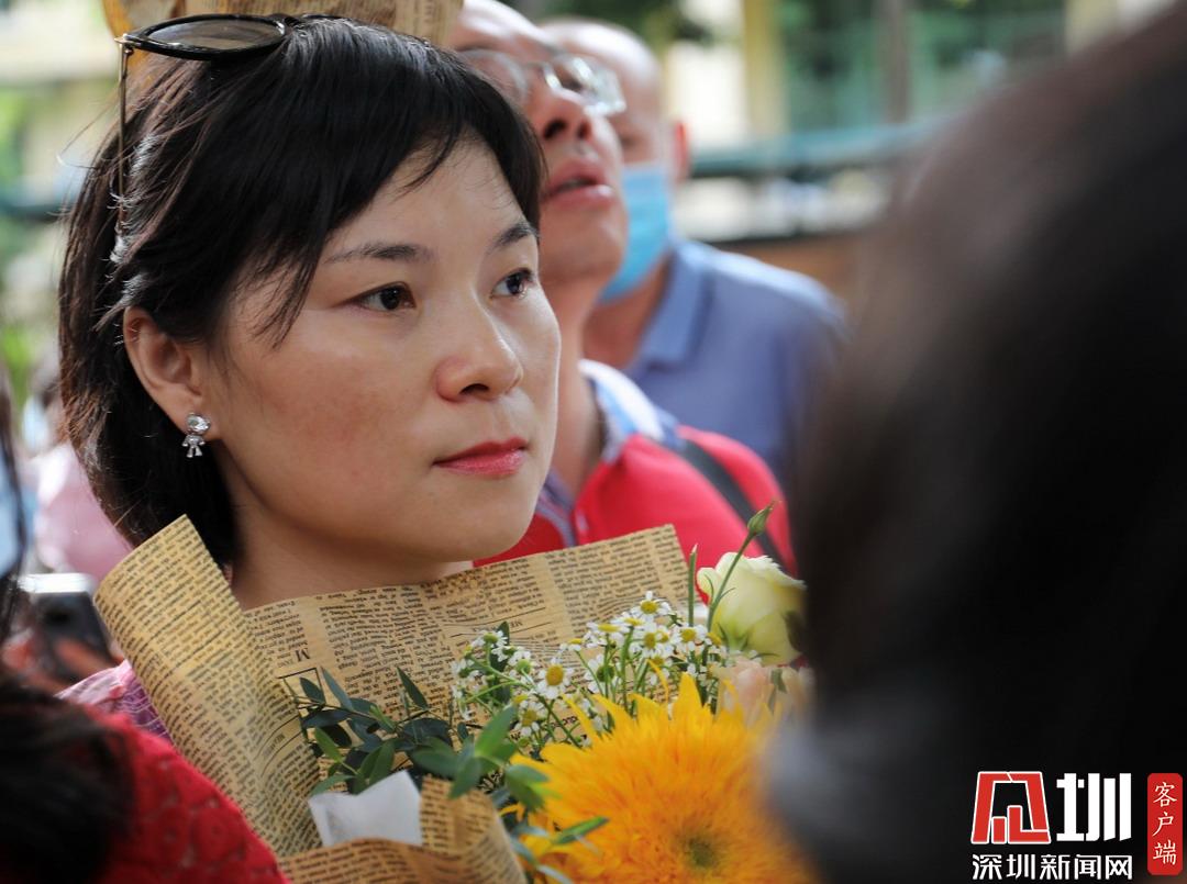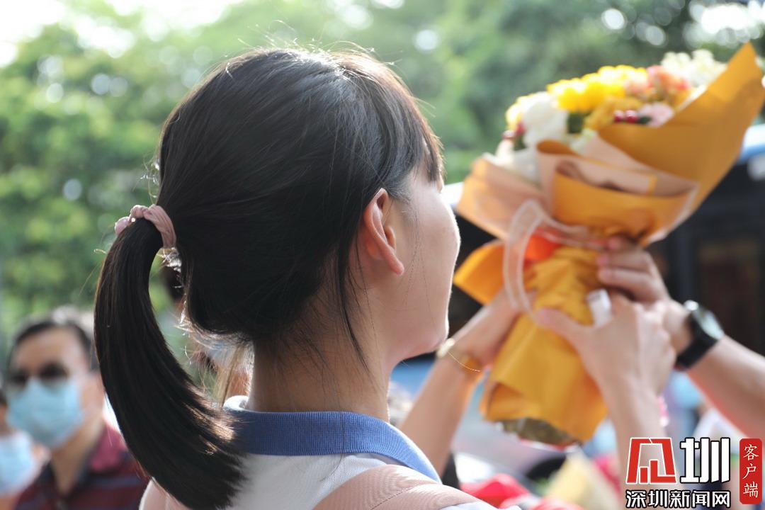 深圳高級(jí)中學(xué)考點(diǎn)外家長(zhǎng)受捧鮮花、滿(mǎn)懷期待。