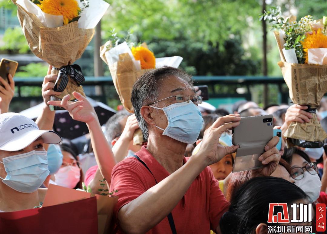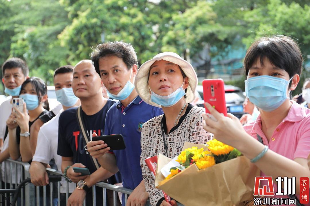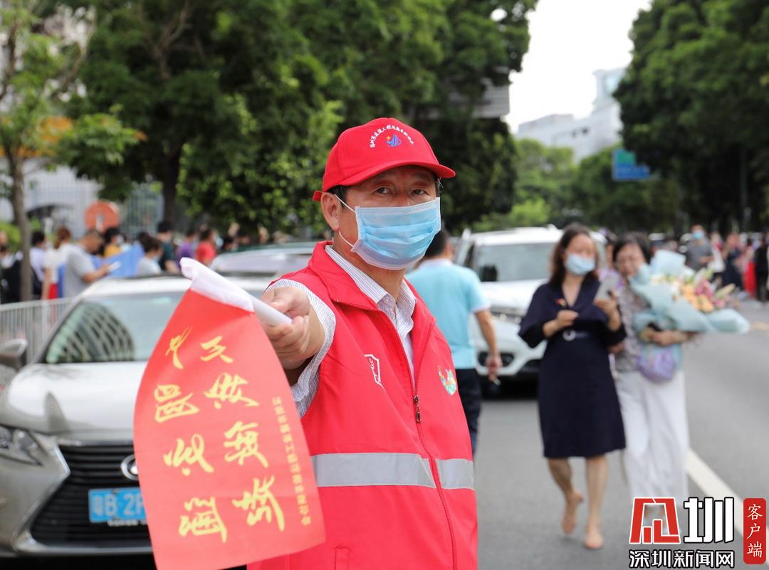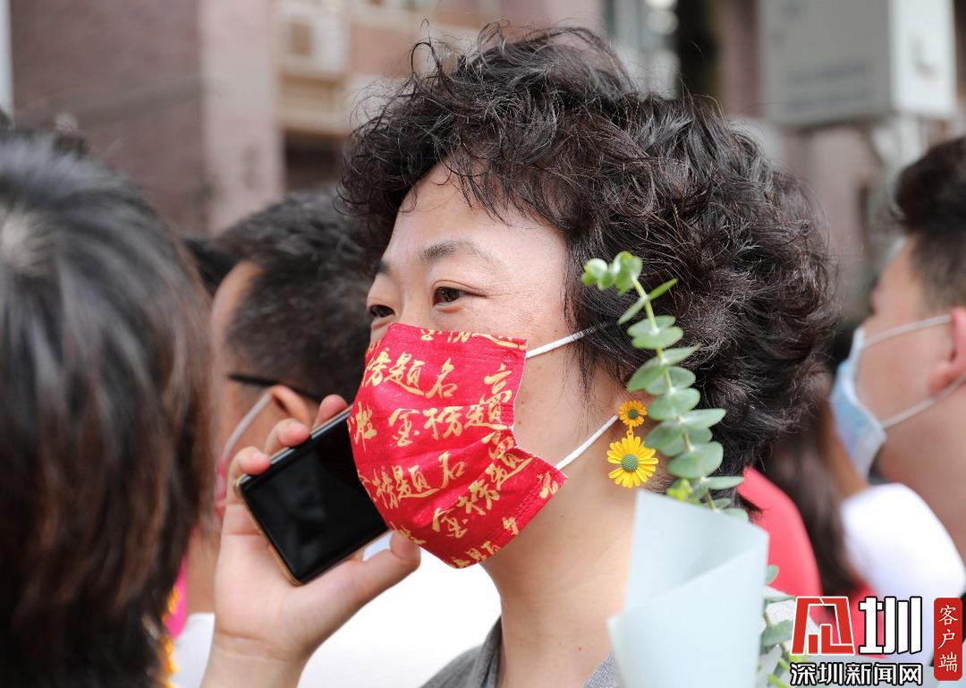 深圳高級(jí)中學(xué)考點(diǎn)外家長(zhǎng)受捧鮮花、滿(mǎn)懷期待。