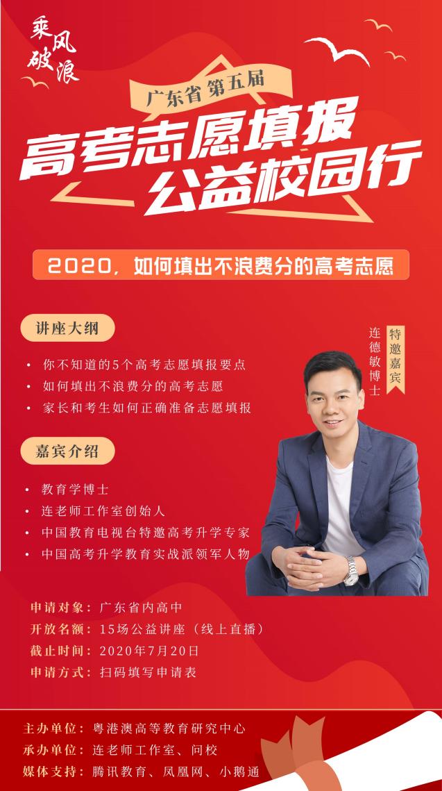 見圳客戶端·深圳新聞網(wǎng)2020年7月9日訊 (記者 陳彬)高考是每一位高三學(xué)子夢(mèng)想的起點(diǎn),但高考不只是一場(chǎng)考試,還有考試之后的志愿填報(bào);如何科學(xué)、專業(yè)的填報(bào)志愿,直接關(guān)系著考生能否獲得心儀大學(xué)和專業(yè)的錄取。7月6日,以《2020,如何填出不浪費(fèi)分的高考志愿》為主題的廣東省第五屆高考志愿填報(bào)公益校園行正式啟動(dòng),該活動(dòng)由粵港澳高等教育研究中心主辦,連老師工作室承辦,將面向廣東省內(nèi)高中,以學(xué)校或班級(jí)為單位,舉辦15場(chǎng)志愿填報(bào)公益講座,講座全程特邀連德敏博士擔(dān)任主講嘉賓。