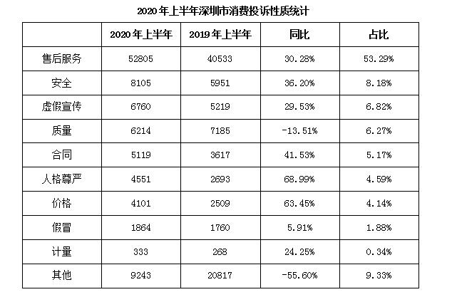 根據(jù)《情況分析》,2020年上半年,深圳市消委會(huì)收到的消費(fèi)投訴問(wèn)題性質(zhì)最多的為售后服務(wù),共52805宗,占比53.29%;其次為安全問(wèn)題,共8105宗,占比8.18%;第三是虛假宣傳問(wèn)題,共6760宗,占比6.82%。有關(guān)人格尊嚴(yán)問(wèn)題、價(jià)格問(wèn)題的投訴量與2019年相比均同比上漲超過(guò)60%;有關(guān)質(zhì)量問(wèn)題的投訴量與2019年相比均有所下降。
