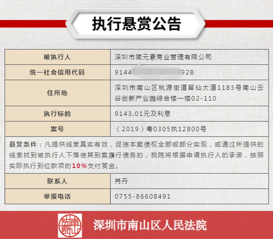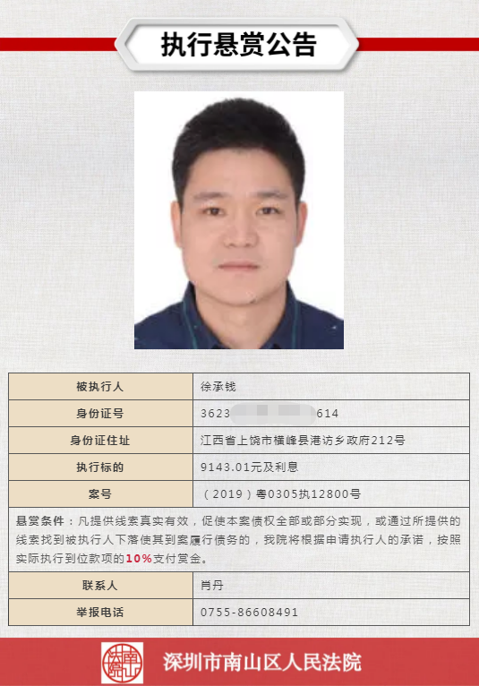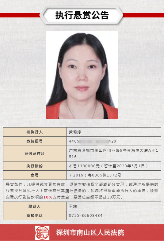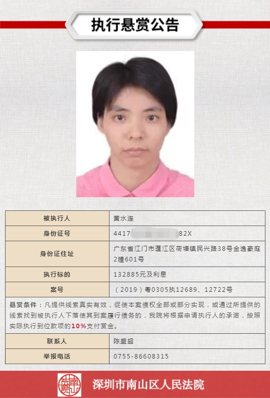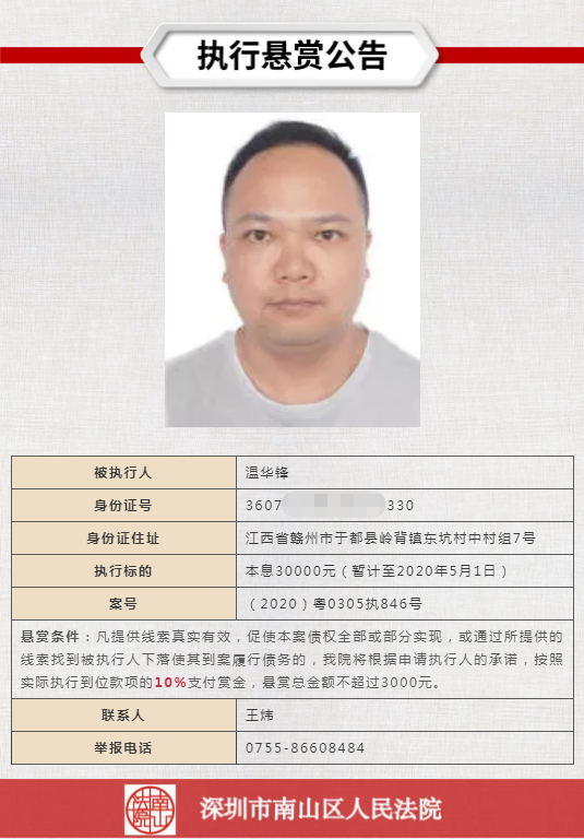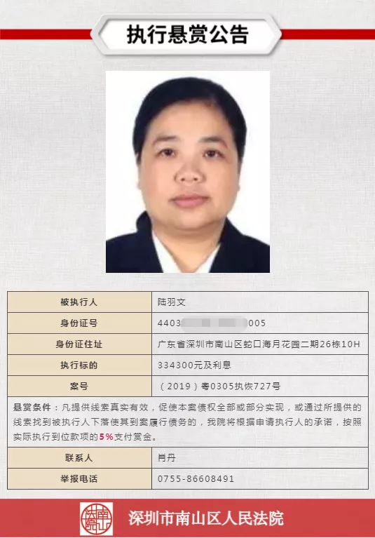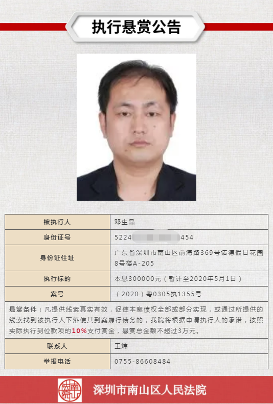 經申請執(zhí)行人申請,深圳市南山區(qū)人民法院向社會發(fā)布懸賞舉報公告,凡提供線索真實有效,促使本案債權全部或部分實現,或通過所提供的線索找到被執(zhí)行人下落使其到案履行債務的,深圳市南山區(qū)人民法院將根據申請執(zhí)行人的承諾,按照實際執(zhí)行到位款項給予一定金額的賞金。