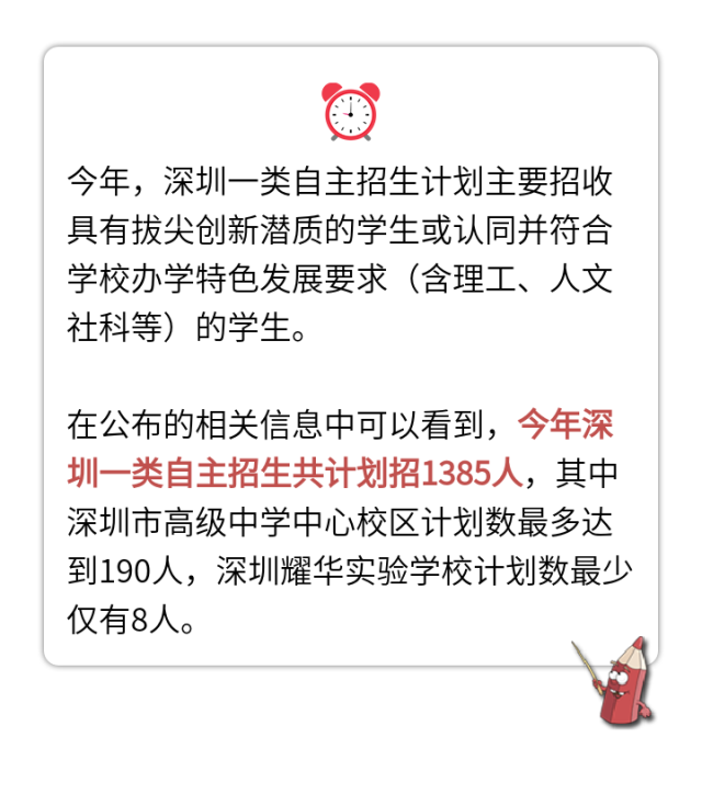 根據(jù)最新方案顯示,今年,深圳首次將公辦普通高中原體育、藝術(shù)特色團隊和體育、藝術(shù)術(shù)科特色班,民辦普通高中自主招生,全部納入普通高中學校自主招生計劃內(nèi)統(tǒng)籌安排。共有47所學校開展自主招生,按自主招生一類、自主招生二類設(shè)置招生類別。