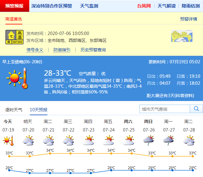 見圳客戶端·深圳新聞網(wǎng)2020年7月19日訊 深圳市氣象臺預(yù)計,19-20日我市多云間晴天,局地有短時(雷)陣雨,氣溫28℃-33℃,中北部最高氣溫34℃-35℃;21-25日晴天到多云,局部偶有短時(雷)陣雨,悶熱加劇。