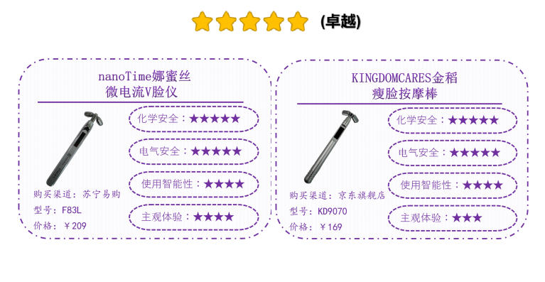 經(jīng)測試,綜合化學(xué)安全、電氣安全、使用智能性、主觀體驗等消費者關(guān)心的多個維度,2款微電流型家用美容儀和1款電離子型美容儀品質(zhì)領(lǐng)跑表現(xiàn)卓越,分別為,國產(chǎn)品牌nanoTime娜蜜絲F83L微電流V臉儀和KINGDOMCARES金稻 KD9070瘦臉按摩棒;日本品牌Panasonic松下 EH-ST50面部護理器(溫?zé)犭x子美容儀)。