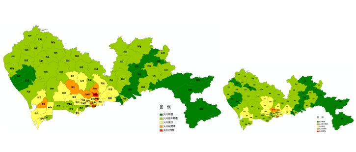 圖3 預(yù)計(jì)臺(tái)風(fēng)季工作日(左)、普通工作日(右)晚高峰全市主要街道交通運(yùn)行狀態(tài)圖