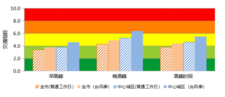 圖1 預(yù)計(jì)臺(tái)風(fēng)季工作日全市及中心城區(qū)交通指數(shù)與普通工作日對(duì)比