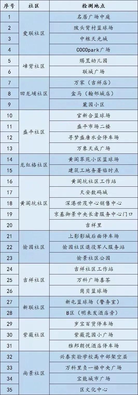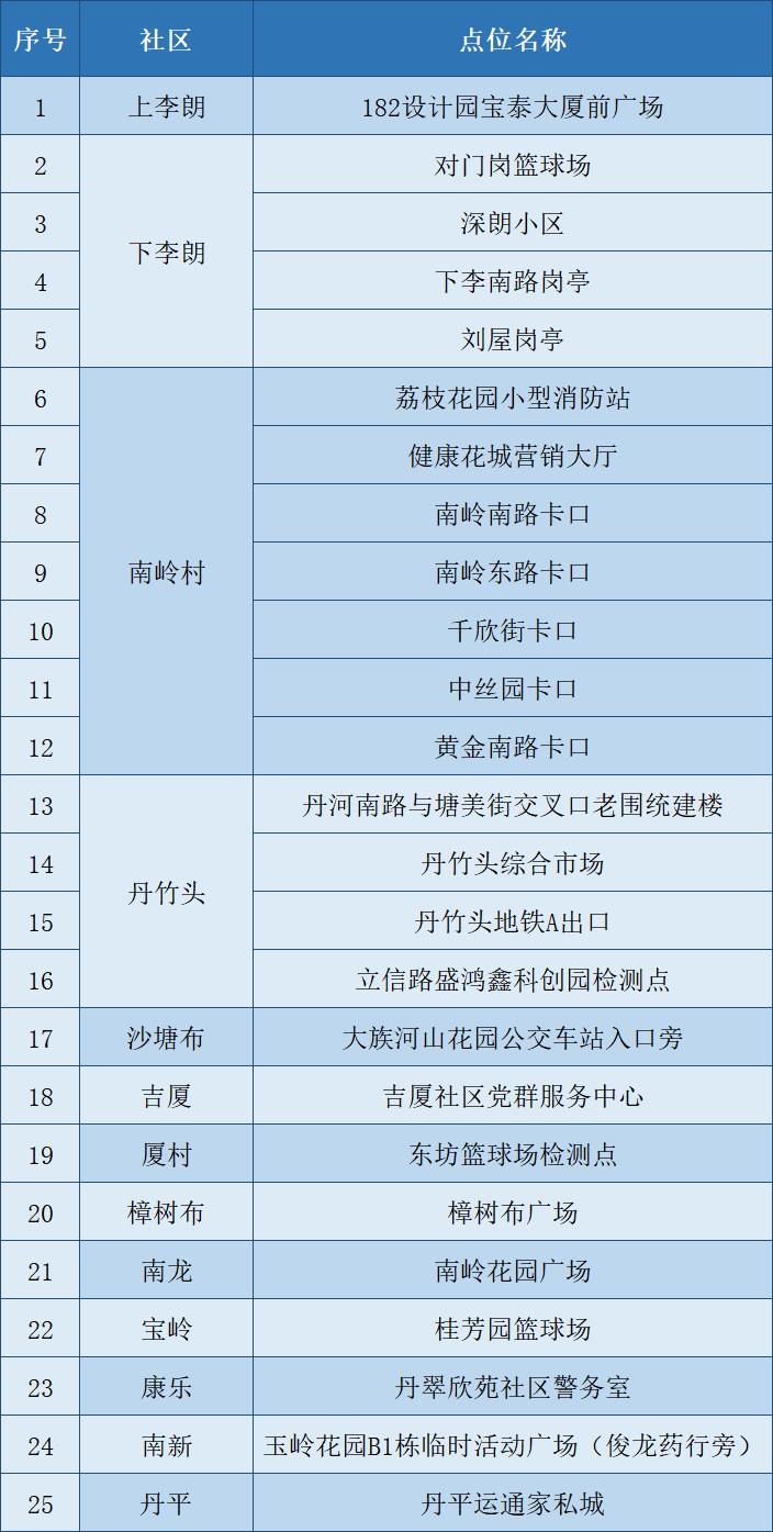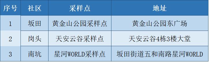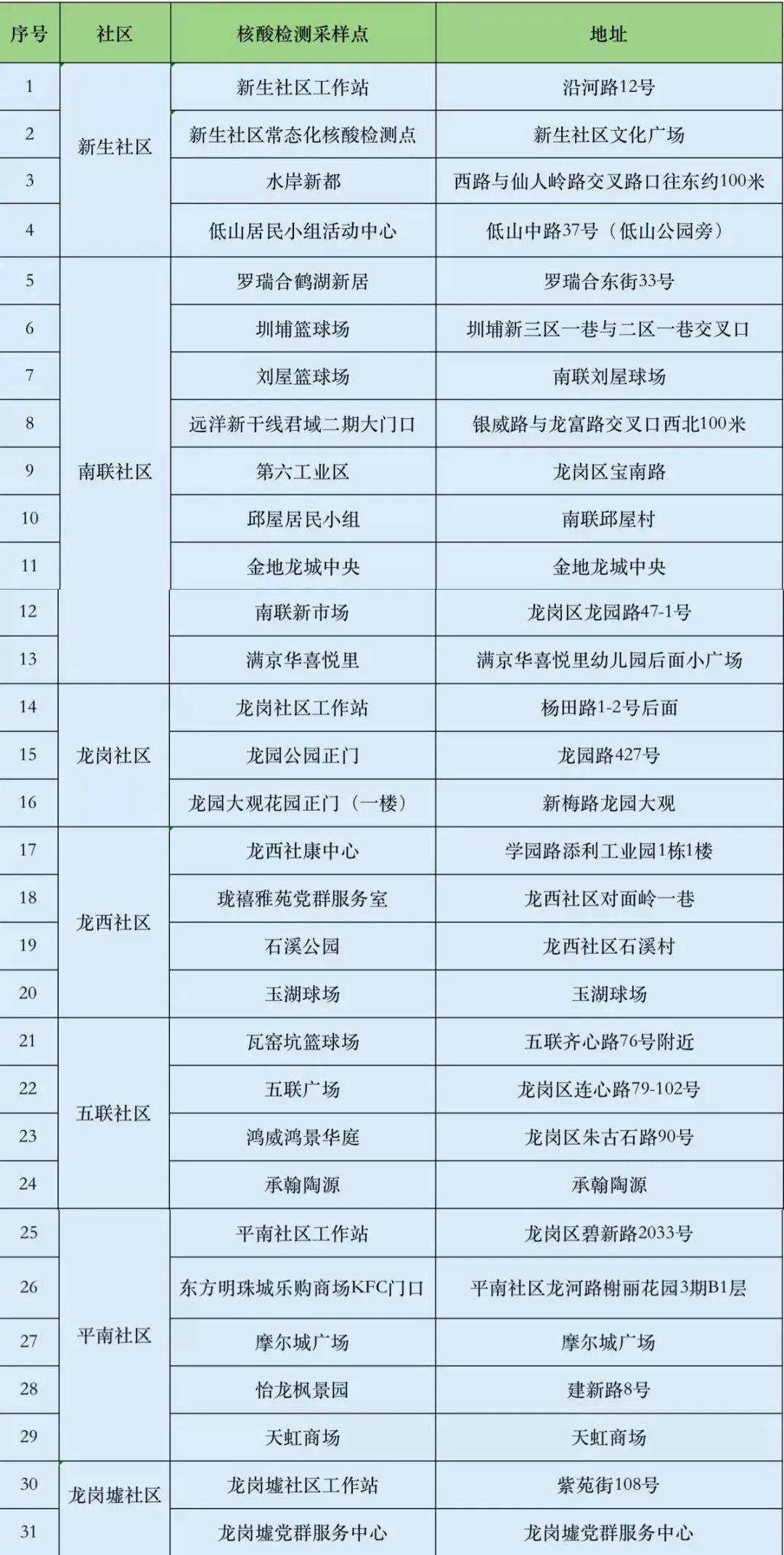 根據(jù)疫情防控需要,為最大程度保障人民群眾生命安全和身體健康,龍崗區(qū)各街道于1月10日開展新一輪免費(fèi)核酸檢測以下點(diǎn)位統(tǒng)計(jì)截至1月10日。各點(diǎn)位動(dòng)態(tài)更新請以社區(qū)通知及現(xiàn)場實(shí)際情況為準(zhǔn)。