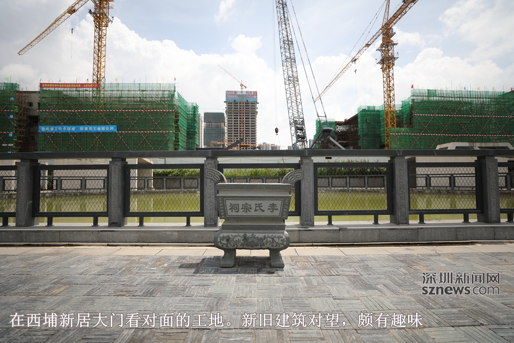 我們到訪西埔新居的時(shí)候,周邊的工地正如火如荼開工,運(yùn)送建筑材料的貨車從西埔新居一側(cè)的通道進(jìn)進(jìn)出出,站在圍屋前的半月形池塘,就可看到高大的吊車和迅速長高的現(xiàn)代樓宇,村里安靜,村外喧囂,兩個(gè)世界。