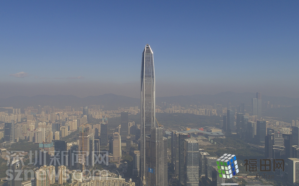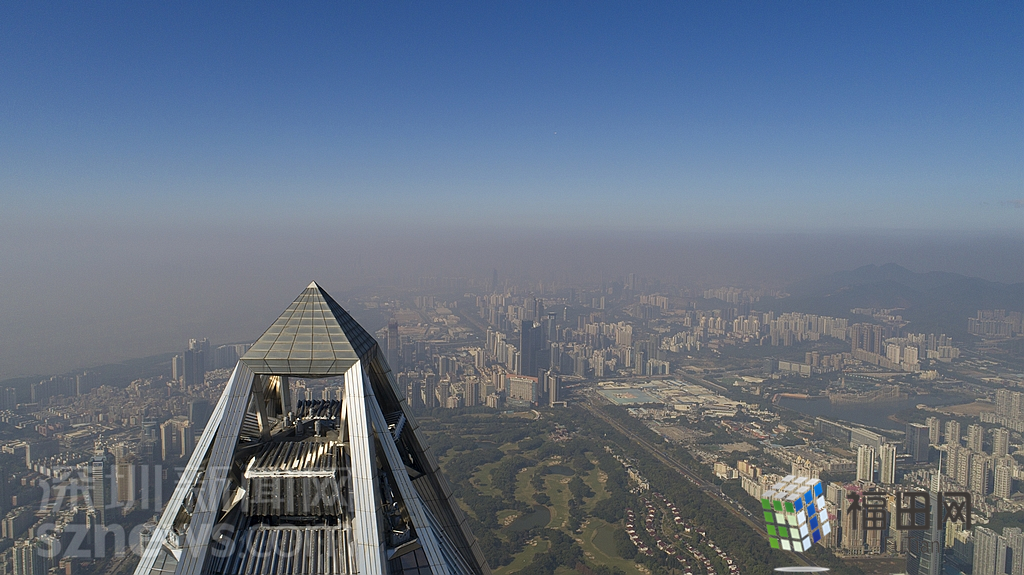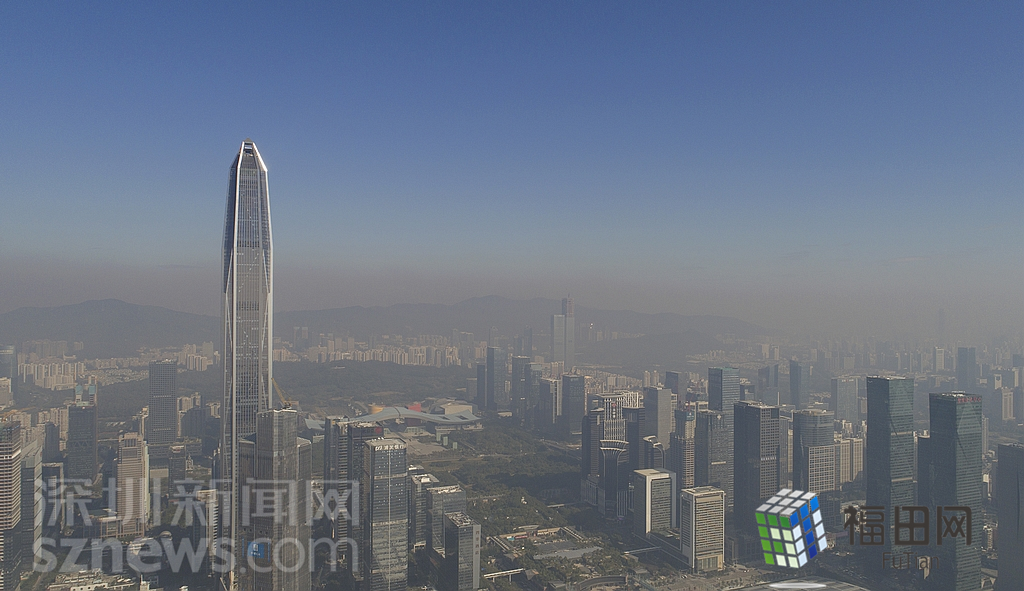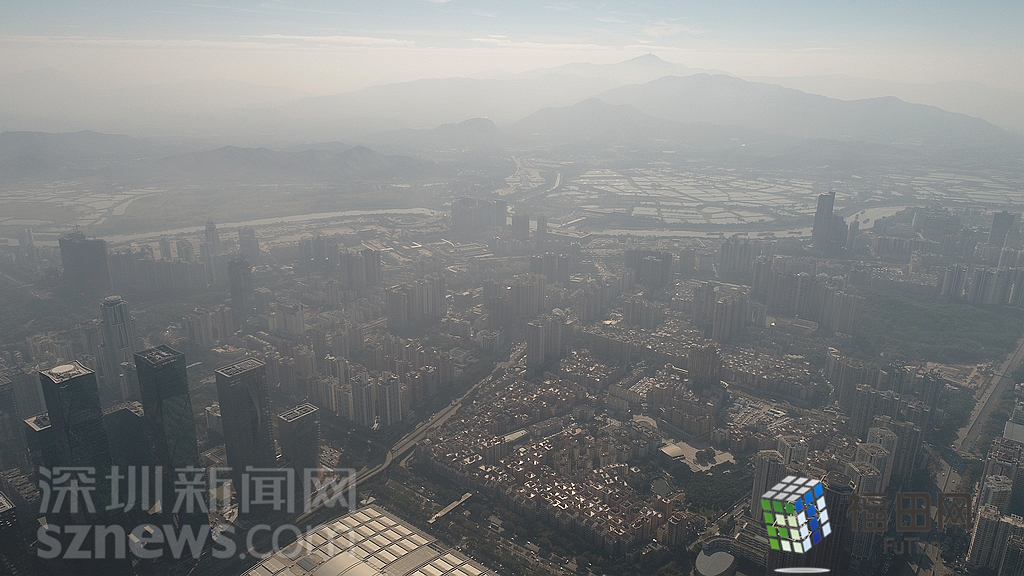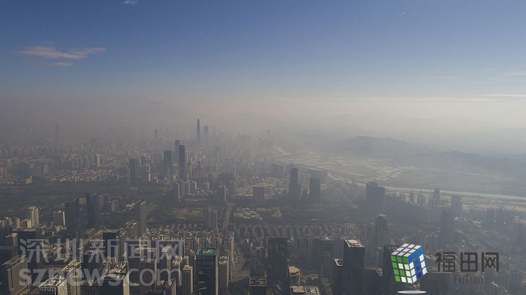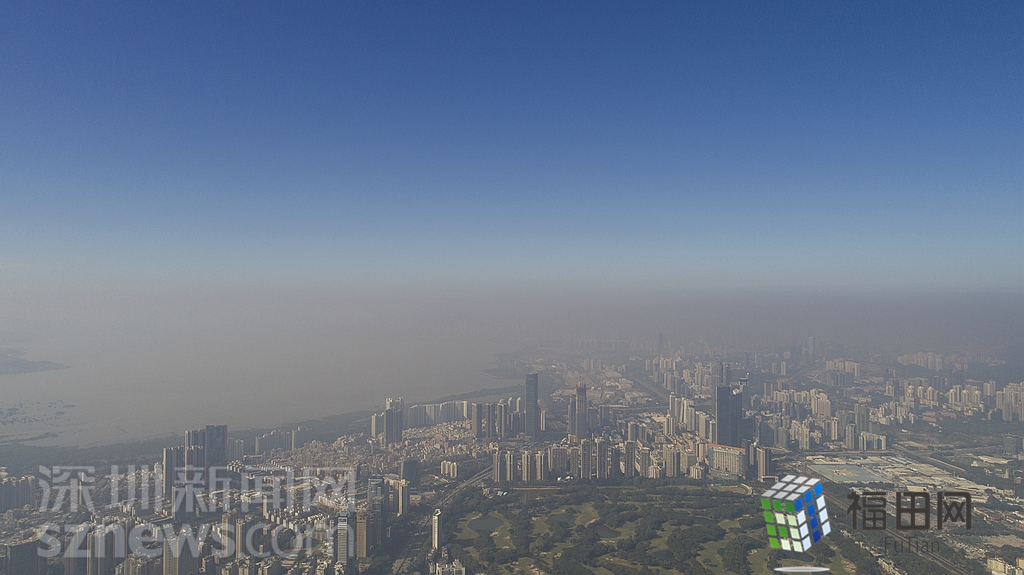 1月18日上午,記者操控?zé)o人機(jī)俯瞰深圳中心區(qū)發(fā)現(xiàn),灰霾將天空“割裂”成一道涇渭分明的界線,把城市籠罩得如同一個(gè)充滿霧靄的森林。從平安金融大廈的上空遠(yuǎn)眺,西南面的深圳灣在灰霾的籠罩下變成了一片“沙漠”,東面的京基一百幾乎被灰霾“吞沒(méi)”,北邊平時(shí)肉眼可看的梅林山也因?yàn)槟芤?jiàn)度較低變得若隱若現(xiàn),南面的米埔濕地也被云遮霧繞。