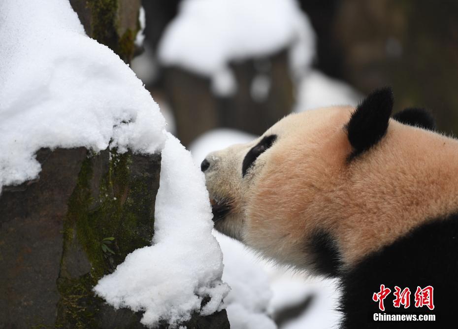 浙江杭州大熊貓雪地里活動(dòng)進(jìn)食憨萌可掬